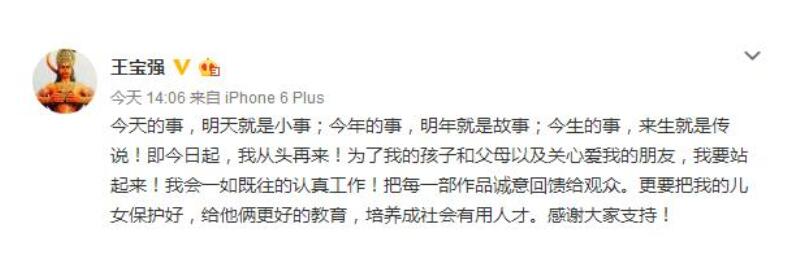 時隔多日,王寶強離婚案吵得沸沸揚揚,今天下午,他更新微博:即今日起,我從頭再來!為了我的孩子和父母以及關心愛我的朋友,我要站起來!我會一如既往的認真工作!把每一部作品誠意回饋給觀眾。更要把我的兒女保護好,給他倆更好的教育,培養成社會有用人才。感謝大家支持!”并配圖:還是那張有兩個酒窩的笑臉,照片中王寶強表情激動,露出笑容,看起來狀態不錯。經歷了離婚風波,希望一切從頭再來!